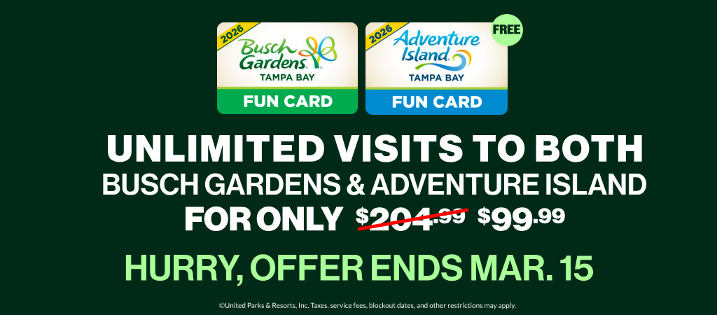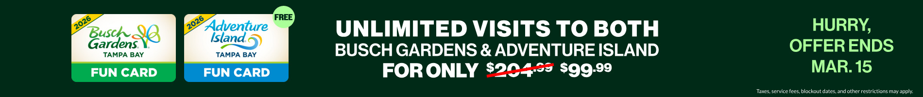 Service fees and taxes not included. 2026 Fun Card valid through December 31, 2026 at Busch Gardens Tampa Bay and Adventure Island. Does not include admission to select special events (including Howl-O-Scream® at Busch Gardens), parking or discounts on food and merchandise. Non-transferable and non-refundable. Not valid with other discounts or special offers. Discounted price applies to online advance purchases only and is not available at the park. Other restrictions apply. Subject to change without prior notice.